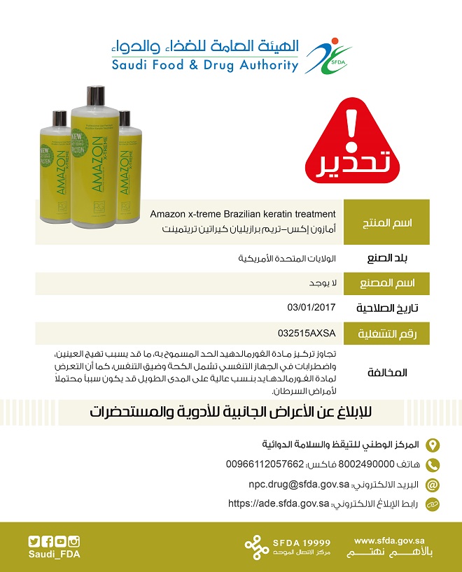 SFDA announced that its specialists had collected and analyzed samples of keratin hair straightening products from the local market to check for their safety, in line with SFDA program regarding control and safety of locally marketed cosmetic products, based on Cosmetics Regulations issued by the Royal Decree Number M/49 dated 18/6/1436H.