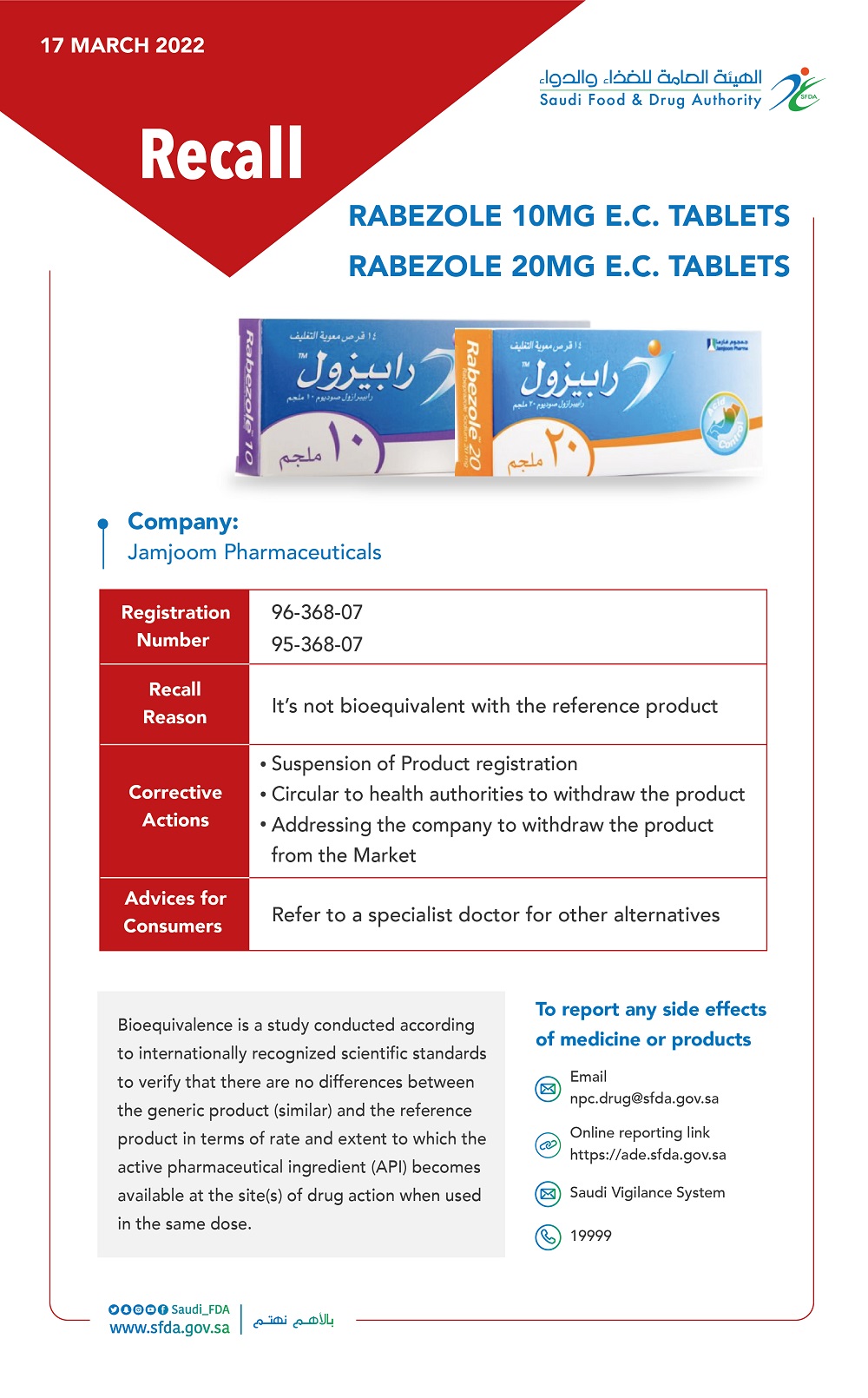 The Saudi Food and Drug Authority (SFDA) has issued a decision to recall and suspend the registration of the product (RABEZOLE) for the two registered strengths of 20 mg and 10 mg, (Registration No 95-368-07 and 96-368-07). The products are marketed by Jamjoom Pharmaceuticals. The decision has been taken as the product was found to be not bioequivalent with the reference product.