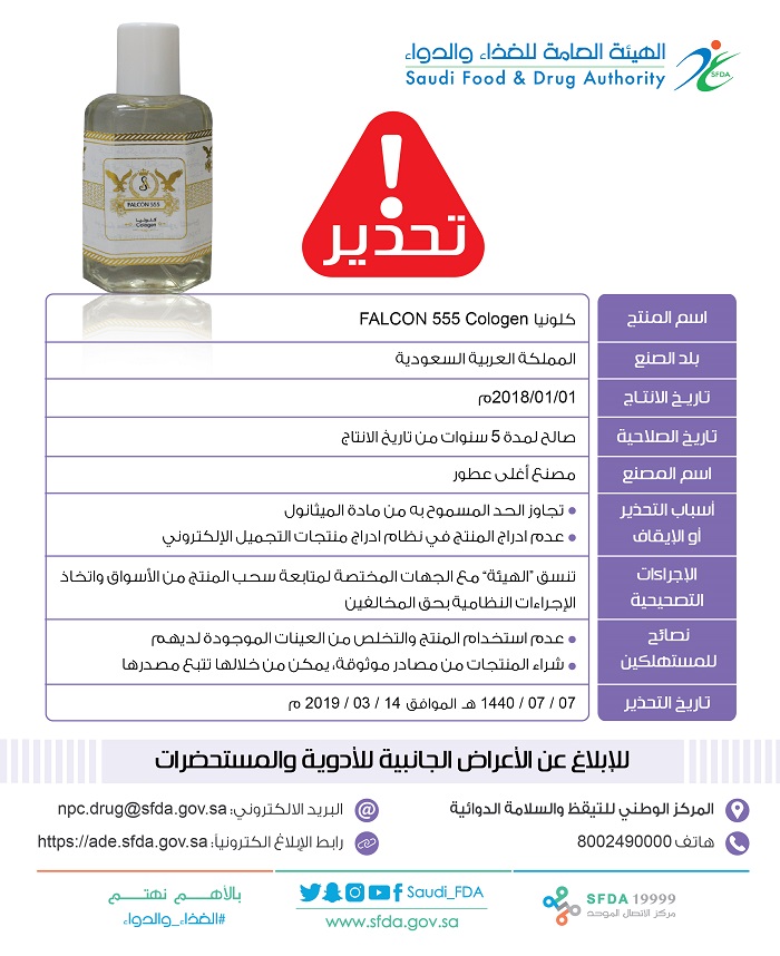 2019-03-26 SFDA Warns Against Using "FALCON 555 Cologen" duo to Contains High Percentage of "Methanol"