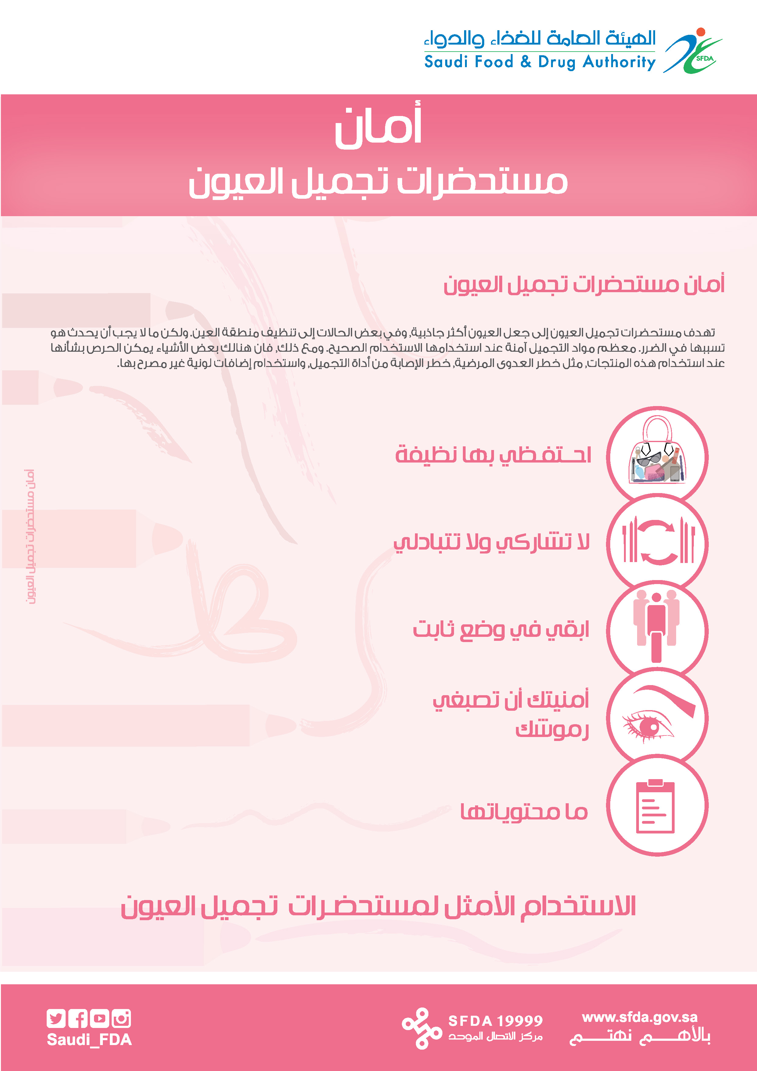 تهدف مستحضرات تجميل العيون إلى جعل العيون أكثر جاذبية, وفي بعض الحالات إلى تنظيف منطقة العين. ولكن ما لا يجب أن يحدث هو تسببها في الضرر. معظم مواد التجميل آمنة عند استخدامها الاستخدام الصحيح. ومع ذلك, فان هنالك بعض الأشياء يمكن الحرص بشأنها عند استخدام هذه المنتجات, مثل خطر العدوى المرضية, خطر الإصابة من أداة التجميل, واستخدام إضافات لونية غير مصرح بها.