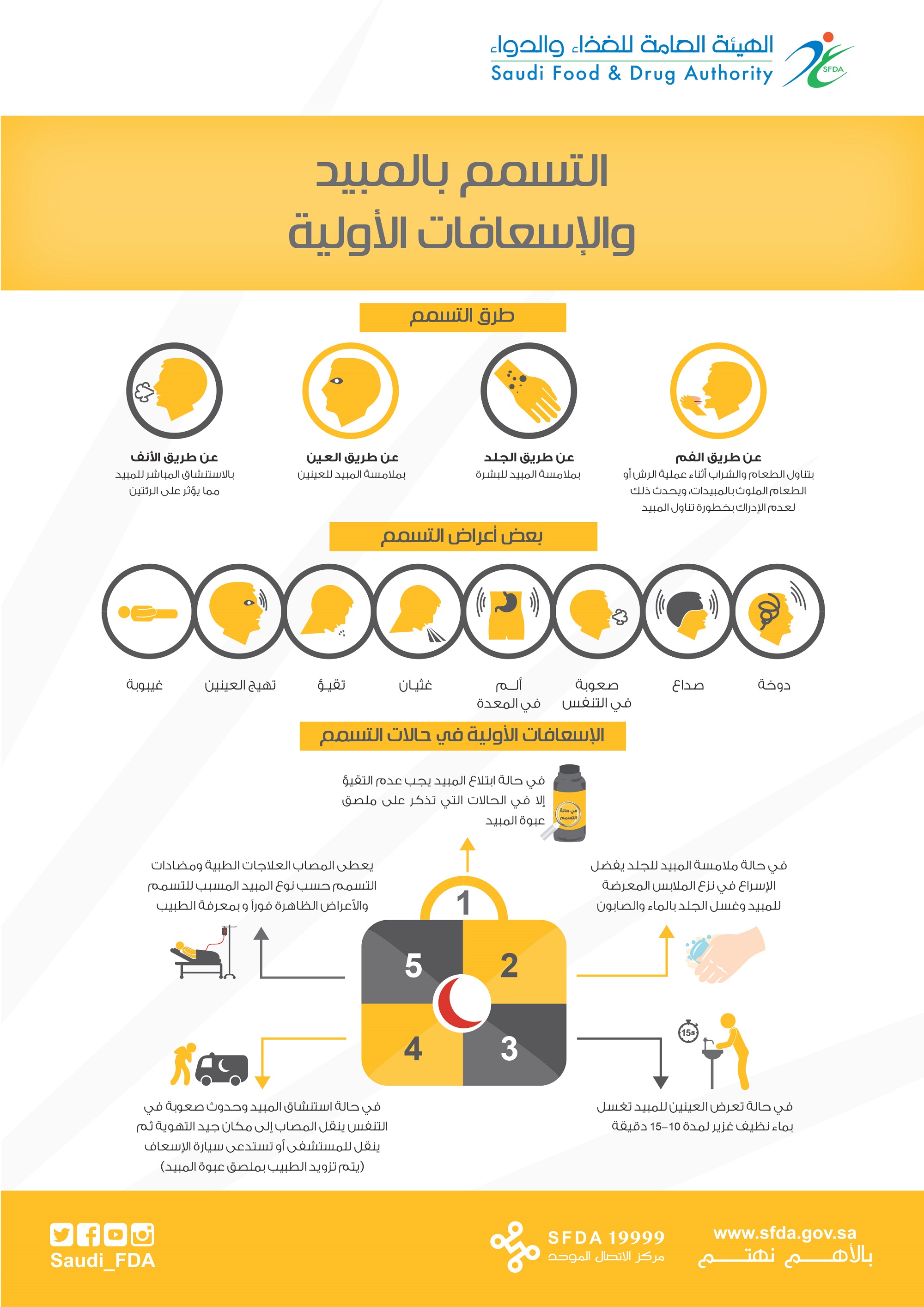 4-  يعطى المصاب العلاجات الطبية ومضادات التسمم حسب نوع المبيد المسبب للتسمم والأعراض الظاهرة فوراً وبمعرفة الطبيب .