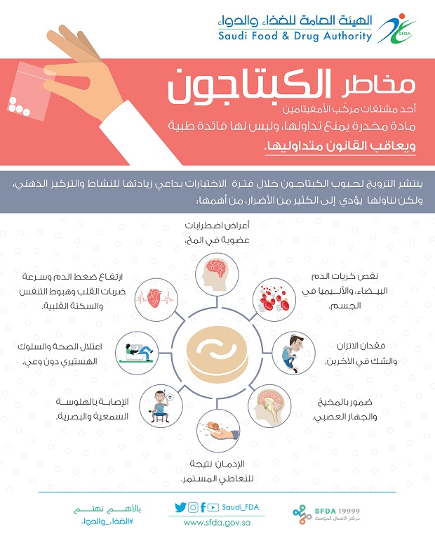 قال المدير التنفيذي للتواصل والتوعية في الهيئة الصيدلي عبدالرحمن السلطان، إن تناول حبوب الكبتاجون يؤدي إلى أضرار كثيرة على الجسم، من بينها اضطرابات في المخ والجهاز العصبي.