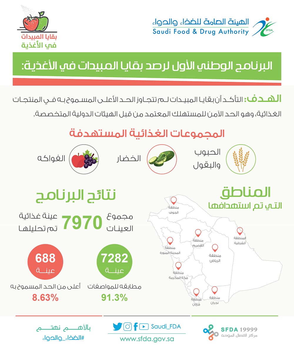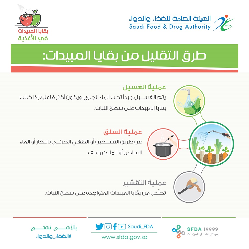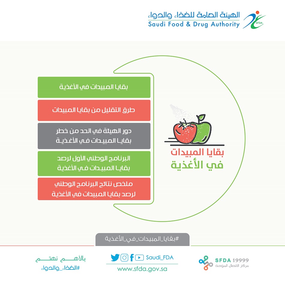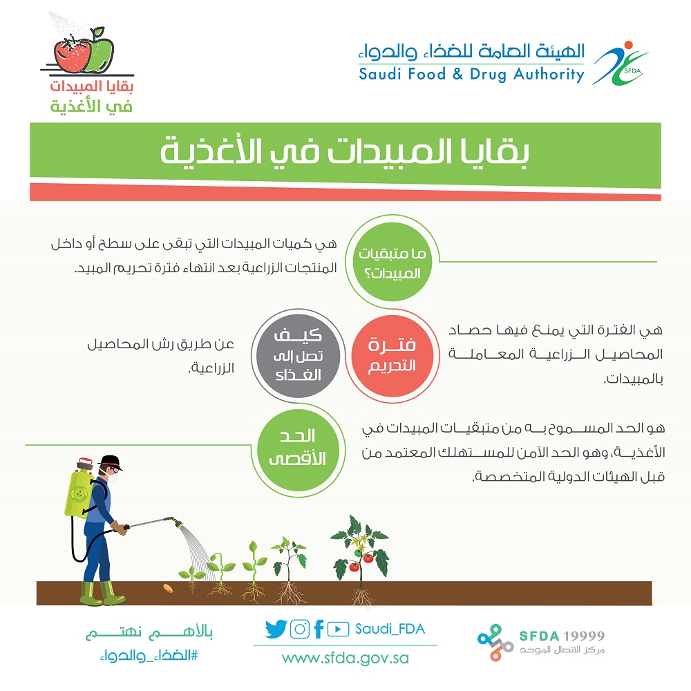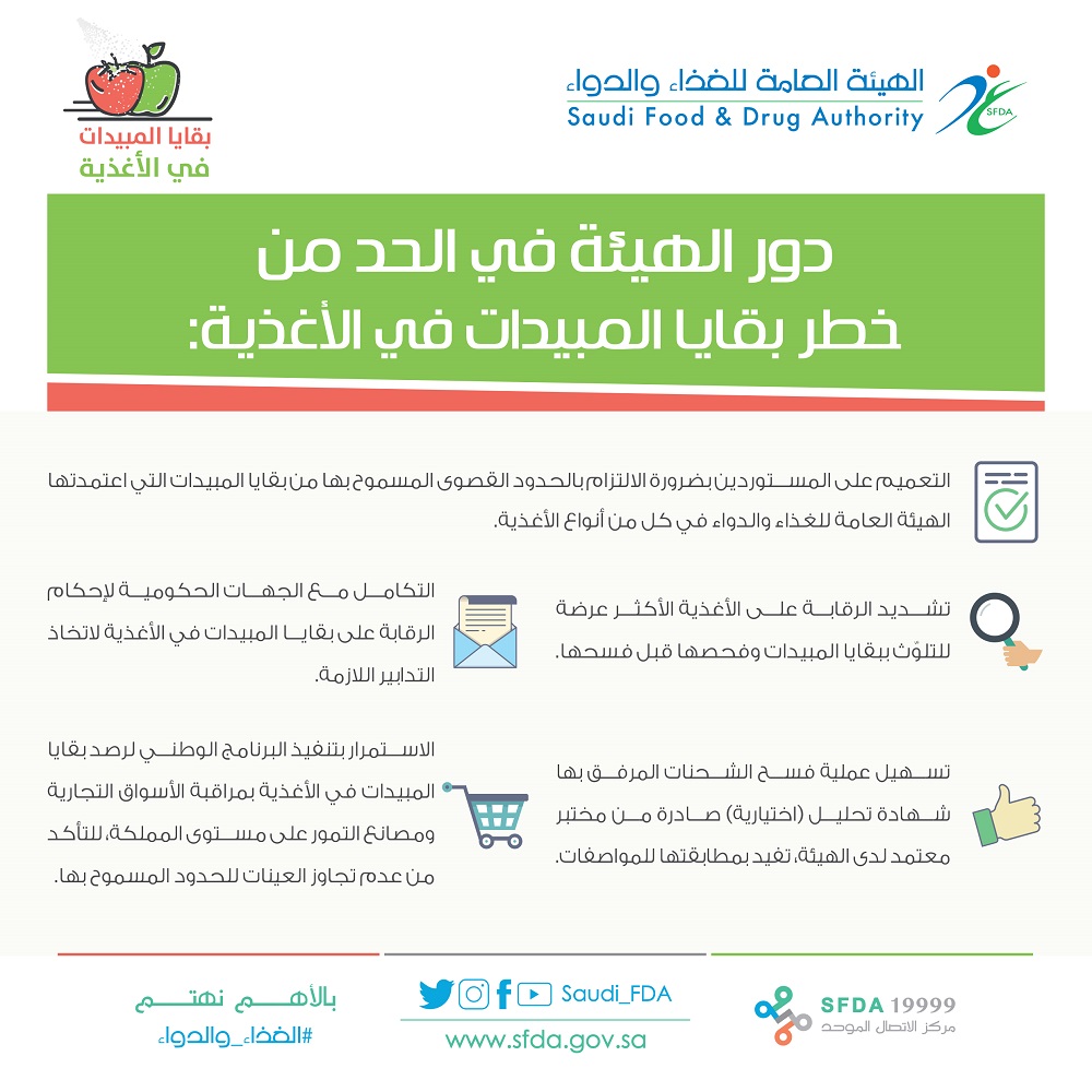 بقايا المبيدات في الأغذية آنفوجرافيك بقايا المبيدات في الأغذية طرق التقليل من بقايا المبيدات دور الهيئة في الحد من خطر بقايا المبيدات في الأغذيئة البرنامج الوطني الأول لرصد بقايا المبيدات في الأغذية معلومات ملخص نتائج البرنامج الوطني لرصد بقايا المبيدات في الأغذية