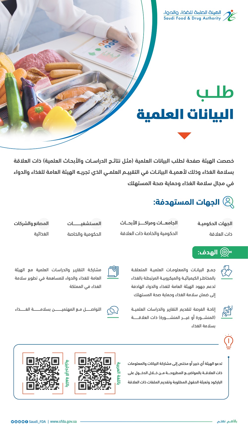 دشّنت الهيئة العامة للغذاء والدواء صفحة الكترونية مخصصة لطلب البيانات العلمية من نتائج دراسات وأبحاث علمية ذات علاقة بسلامة الغذاء، وذلك لأهمية البيانات في التقييم العلمي الذي تجريه "الهيئة" في مجال سلامة الغذاء وحماية صحة المستهلك.