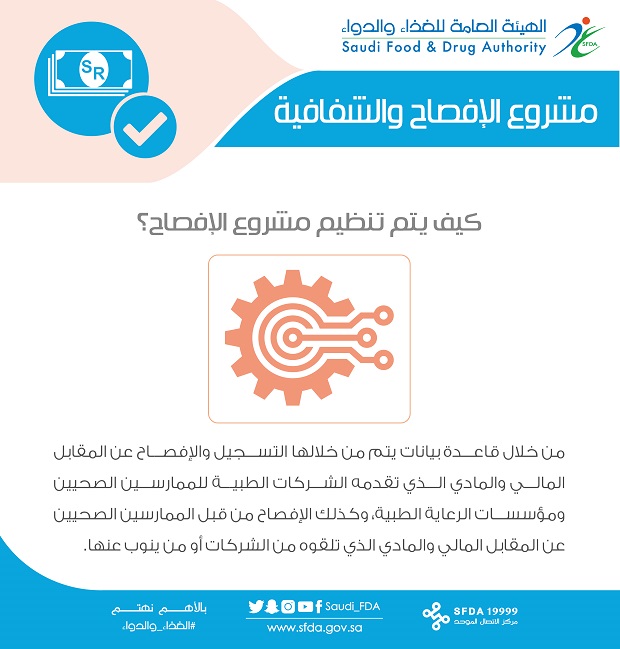 أنشأت الهيئة العامة للغذاء والدواء البوابة الصحية للإفصاح والشفافية، ضمن برنامج الإفصاح والشفافية في التعاملات المالية بين الشركات الطبية والممارسين الصحيين، لرفع مستوى الشفافية ووضع الآليات الملزمة للشركات للإفصاح عن كل أشكال الدعم المالي والمادي المقدم للممارسين الصحيين منعاً لحدوث تعارض مصالح.