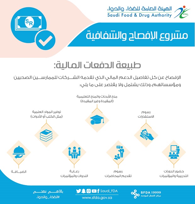 وأوضح نائب الرئيس التنفيذي لقطاع الدواء بالهيئة العامة للغذاء والدواء الدكتور عادل الهرف، أن هذه الخطوة تأتي لتعزيز شفافية هذه التعاملات المالية، وأضاف أن تطبيق هذا البرنامج يبدأ بتاريخ 21/01/1440هـ الموافق 01/10/2018م بحيث تلتزم شركات الأدوية والشركات الطبية والممارسون الصحيون بالإفصاح عن التعاملات المالية كافة فور التطبيق بشكل ربع سنوي، من خلال موقع ، والتعميم بذلك للجهات الصحية كافة.