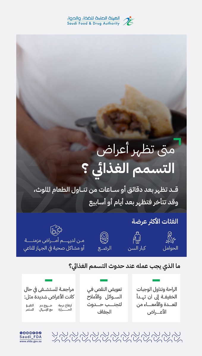 يذكر أن الهيئة العامة للغذاء والدواء نفّذت مؤخراً حملة توعوية عن "التسمم الغذائي" وشاركت عبرها بعدد من المنشورات في حساباتها بمواقع التواصل الاجتماعي، كما نظّمت زيارات توعوية مدرسية، إضافةً إلى توعية الممارسين الصحيين ومقدمي الخدمات الغذائية.