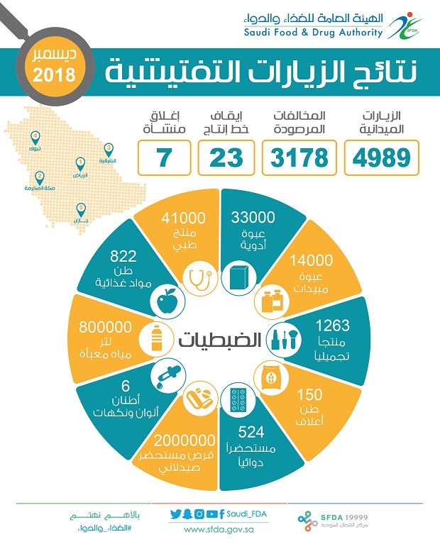 "الغذاء والدواء" تغلق 7 منشآت مخالفة وتوقف 23 خط إنتاج خلال ديسمبر