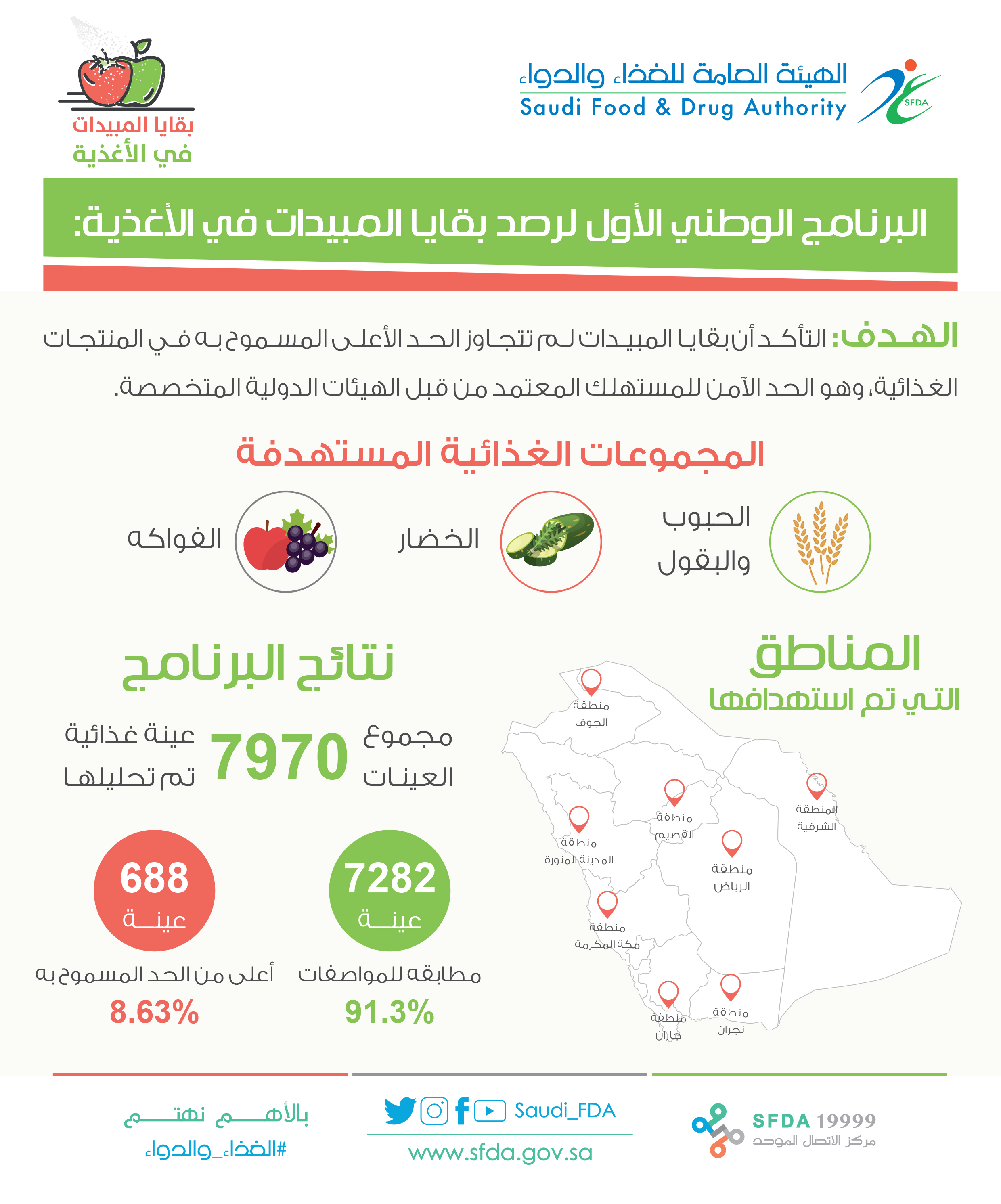 2018-03-28 الغذاء 91.3 % من العينات مطابقة للمواصفات "الغذاء والدواء" تكشف عن نتائج البرنامج الوطني الأول لرصد بقايا المبيدات في الأغذية