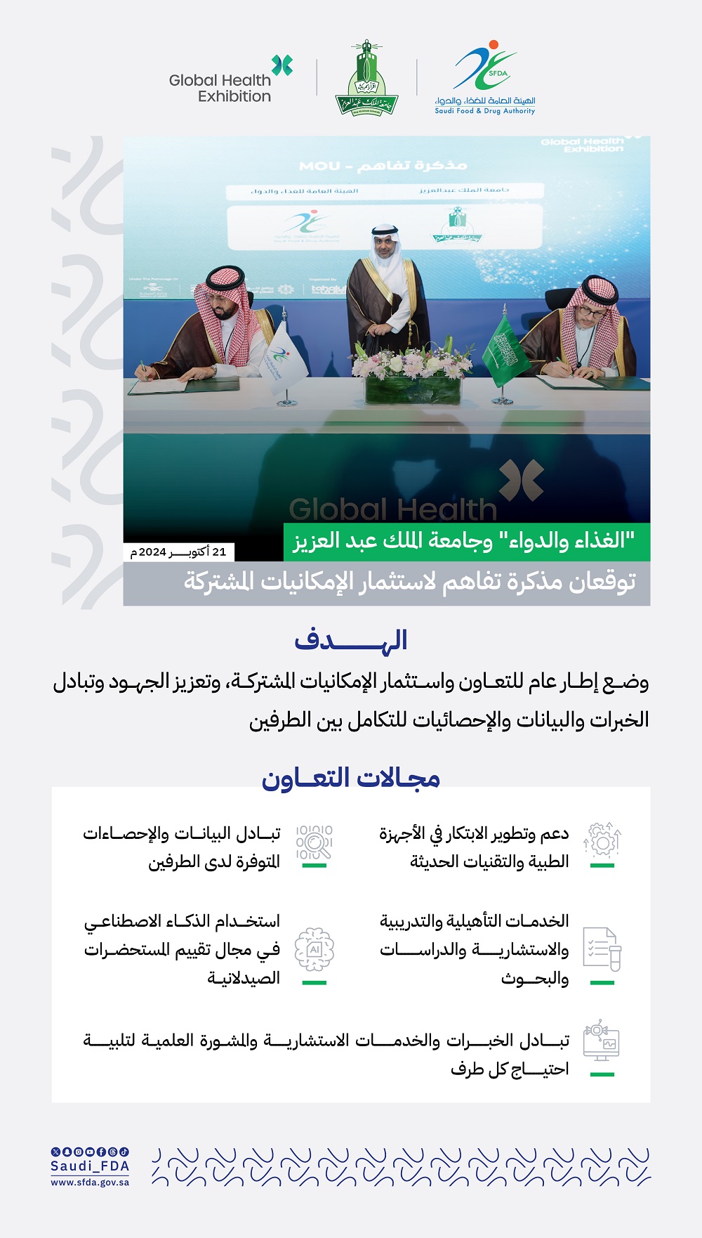 2024-10-21 الهيئة توقيع مذكرة تفاهم بين "الغذاء والدواء" وجامعة الملك عبدالعزيز لاستثمار الإمكانيات المشتركة