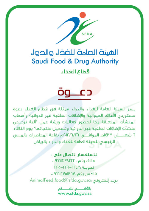2012-06-17 الهيئة دعوة لحضور فعاليات ورشة عمل "آلية ترخيص منشآت الإضافات العلفية غير الدوائية وتسجيل منتجاتها"