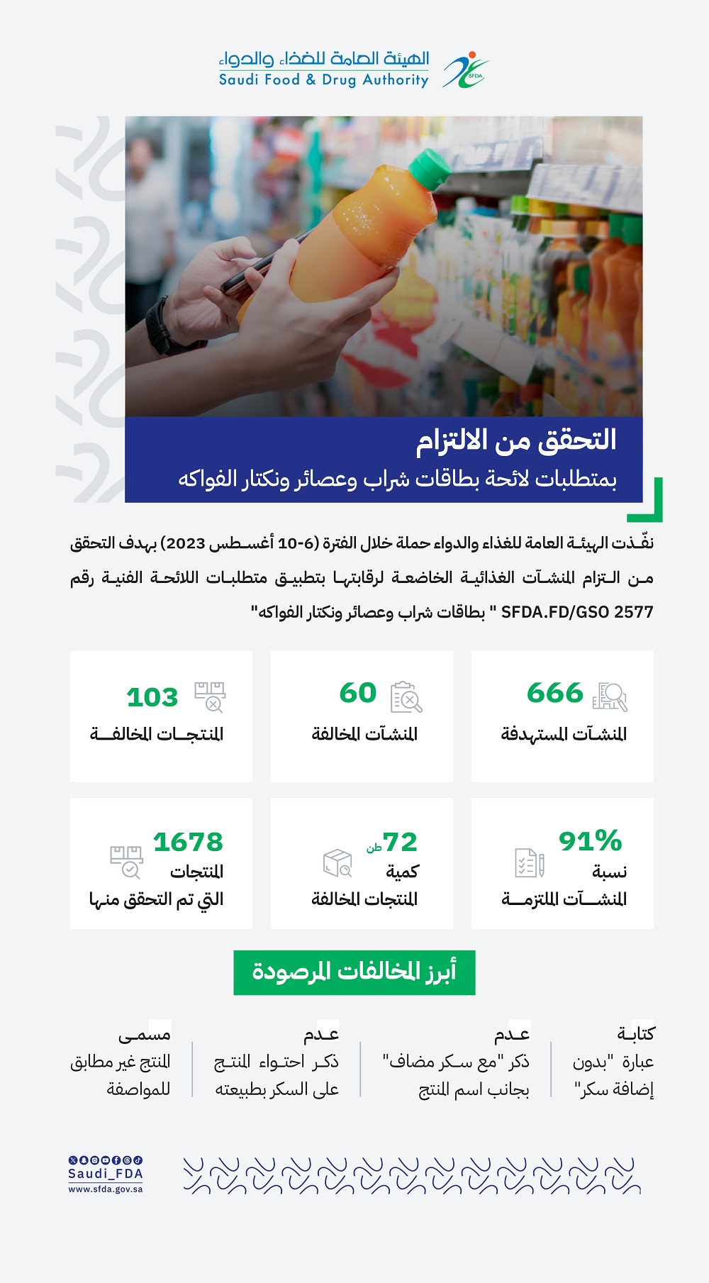 2023-10-10 الغذاء "الغذاء والدواء": 91% من المنشآت الغذائية ملتزمة بمتطلبات لائحة بطاقات شراب وعصائر ونكتار الفواكه