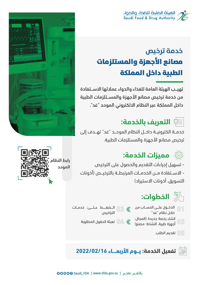 2022-02-16 أجهزة طبية "الغذاء والدواء" تطلق خدمة ترخيص مصانع ومستودعات الأجهزة والمستلزمات الطبية الكترونيًا
