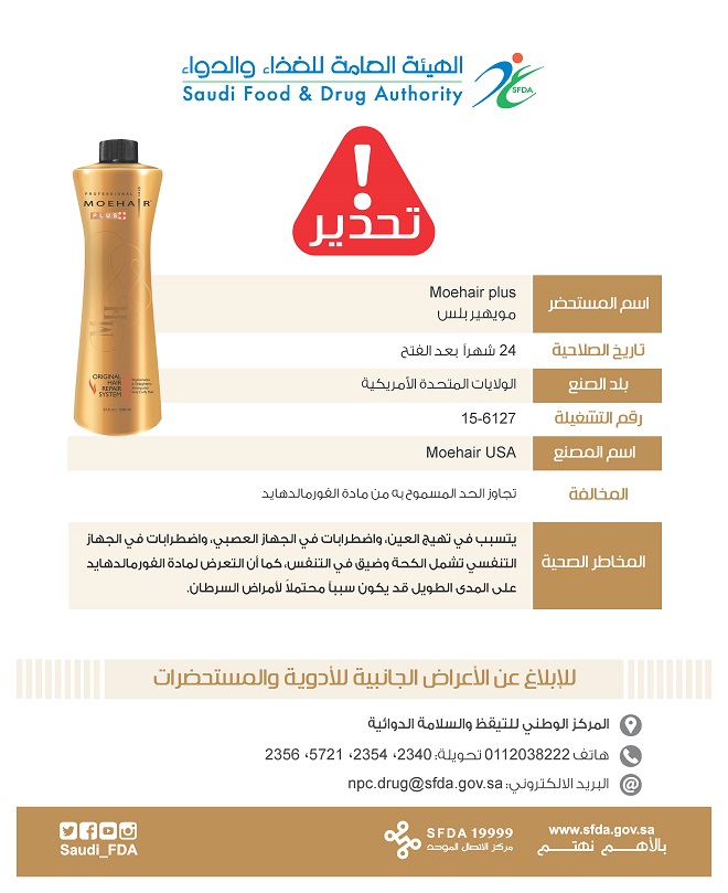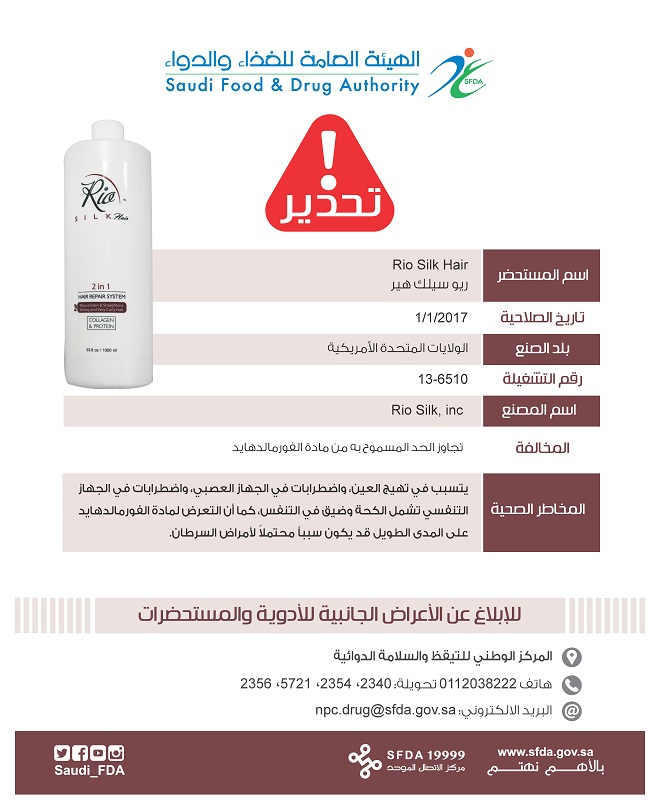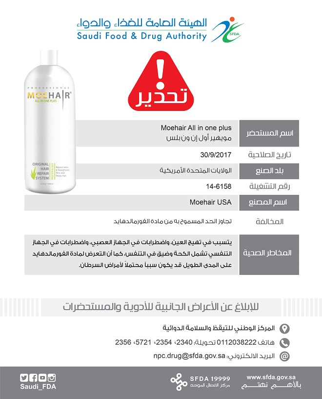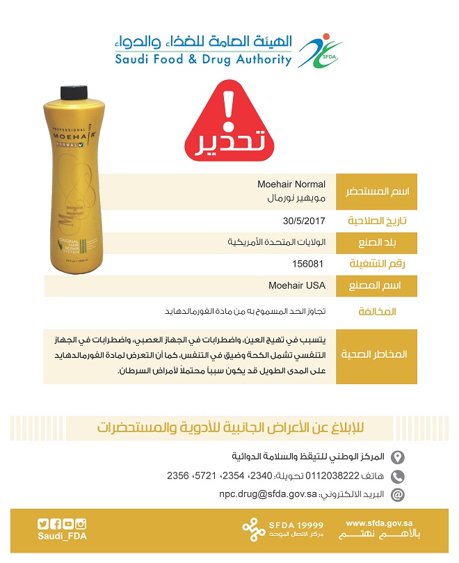 وأوضحت الهيئة، أن متخصصيها جمعوا وحللوا عينات من منتجات فرد الشعر بالكيراتين المتداولة بالأسواق المحلية للتأكد من سلامتها، وأظهرت نتائج التحليل احتواء خمسة منتجات على نسبة عالية من مادة الفورمالدهيد، مشيرة إلى أن مخاطر هذه المادة في حال تجاوزها 0.2% كما هو منصوص عليه في المواصفة القياسية الخليجية رقم GSO 1943/2009 تتضمن تهيج العين، واضطرابات الجهاز العصبي، واضطرابات في الجهاز التنفسي تشمل الكحة وضيق التنفس، إضافة إلى أن التعرض لمادة الفورمالدهايد على المدى الطويل قد يكون سبباً محتملاً لأمراض السرطان.