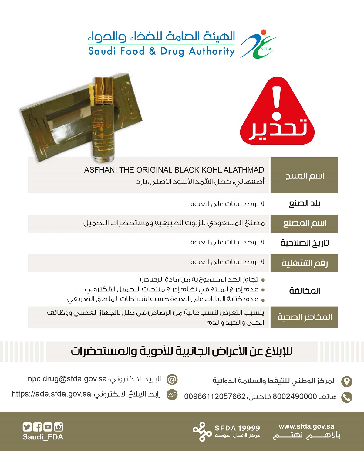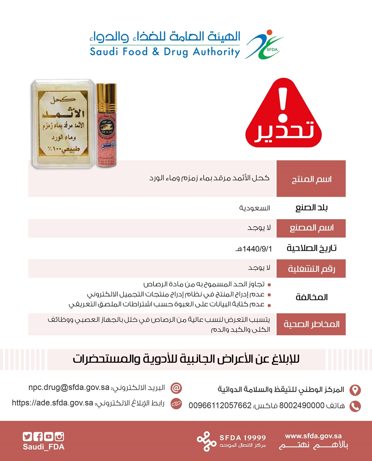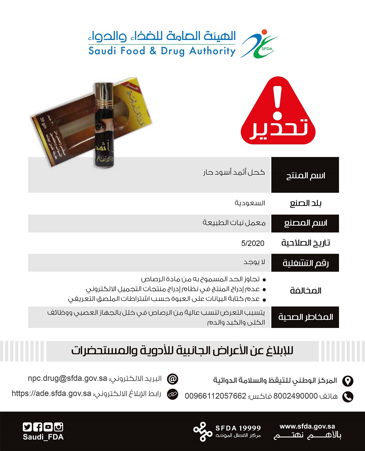 حذرت الهيئة العامة للغذاء والدواء من أربع منتجات من الكحل الأثمد، لاحتوائها على نسبة عالية من الرصاص.