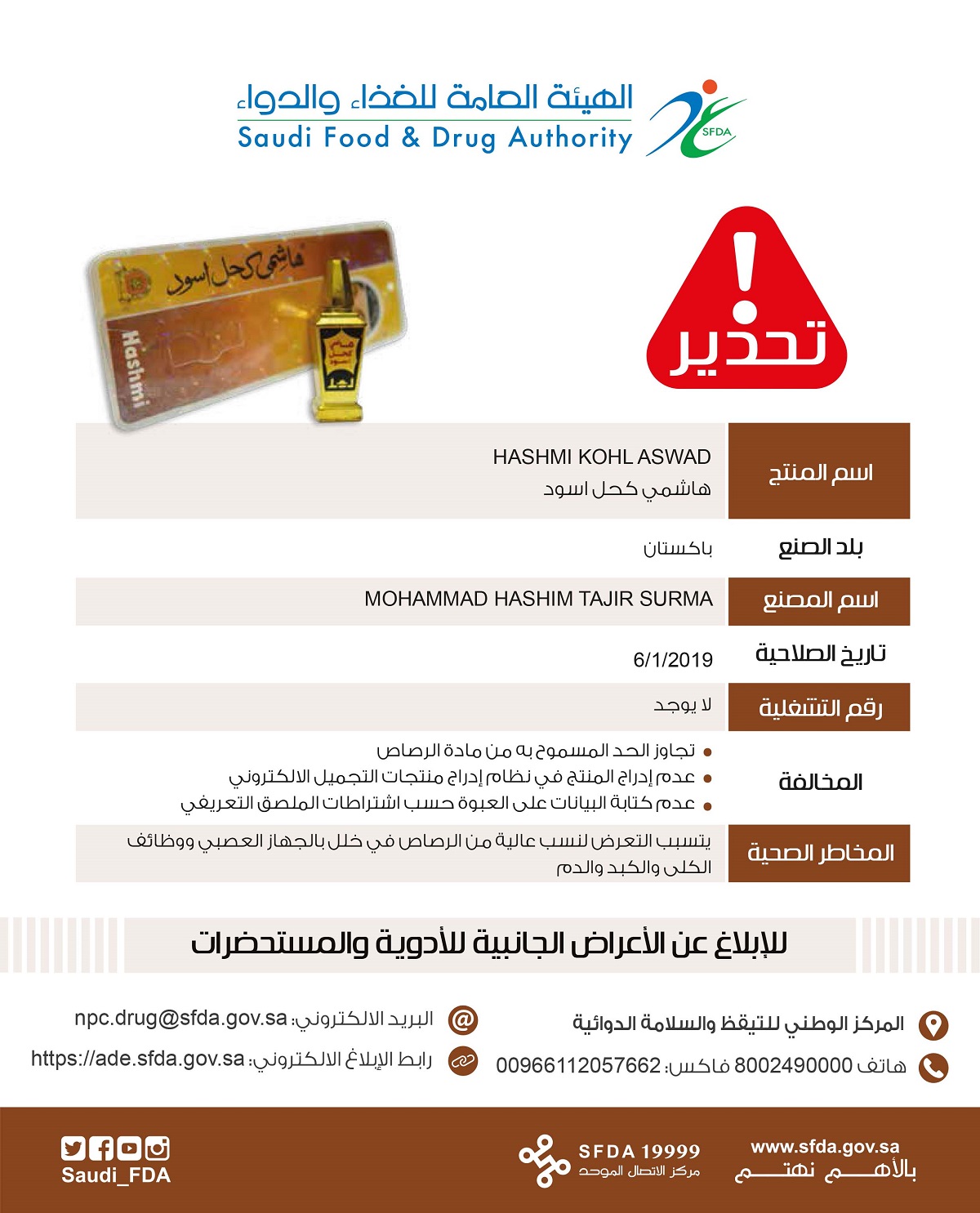 أما المنتج الثاني فهو "هاشمي كحل اسود" (HASHMIKOHL ASWAD)، المصنّع في باكستان، وتاريخ صلاحيته 6/1/2019م.