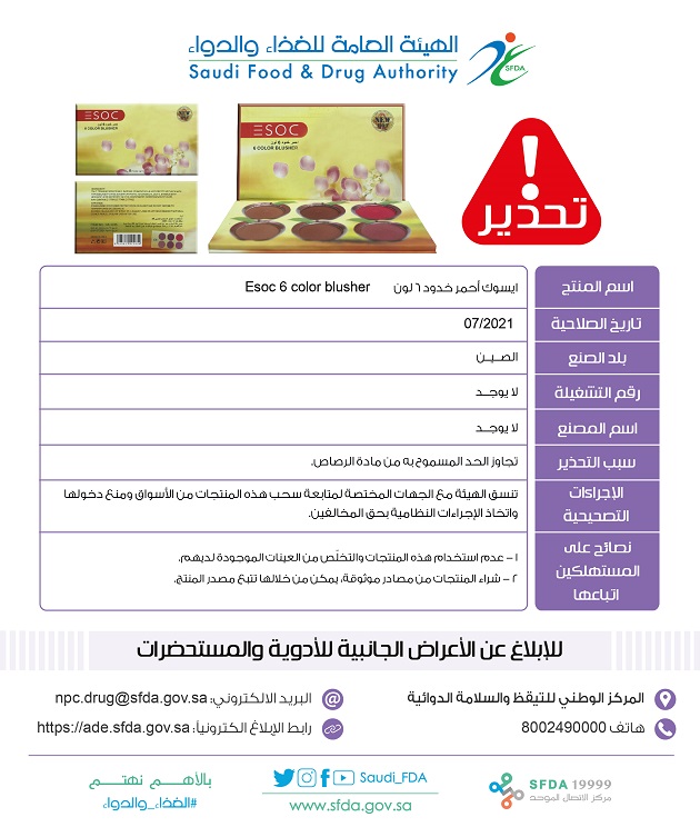 وأضافت أن المنتج يحمل اسم "ايسوك أحمر خدود 6 لون" (Esoc 6 color blusher)، مصنّع في الصين، وتاريخ صلاحيته 07/2021م.