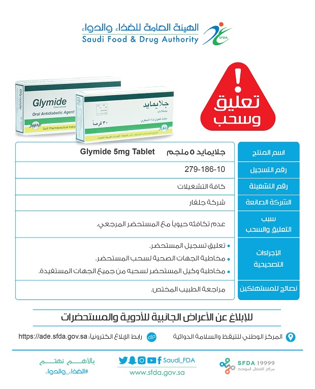 علّقت الهيئة العامة للغذاء والدواء تسجيل مستحضر Glymide 5mg Tablet، ومستحضر Diatab 5mg Tablet، لعدم تكافؤهما حيوياً مع المستحضر المرجعي.