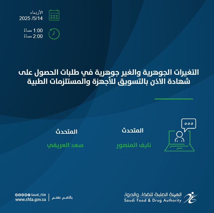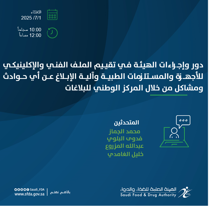 Julyدور وإجراءات الهيئة في تقييم الملف الفني والإكلينيكي للأجهزة والمستلزمات الطبية و ألية الإبلاغ عن أي حوادث او مشاكل من خلال المركز الوطني للبلاغات