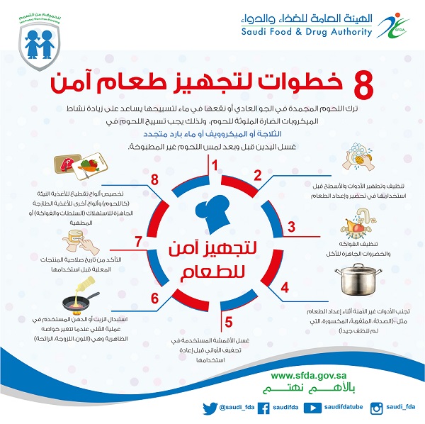 Leaving frozen meat in ordinary air or soaked in water for defrosting, helps harmful microbes to activate in the meat, and therefore defrosting meat shall be in the refrigerator or microwave or running cold water. Always wash your hands before and after touching raw meat. Clean, disinfect and dry tools before each use. Avoid the use of one spoon several times while cooking to taste the food without cleaning it thoroughly after each use.