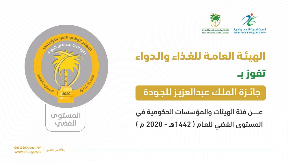 حصدت الهيئة العامة للغذاء والدواء على جائزة الملك عبدالعزيز للجودة عن فئة الهيئات والمؤسسات الحكومية بالمستوى الفضي للعام 1442هـ - 2020م.